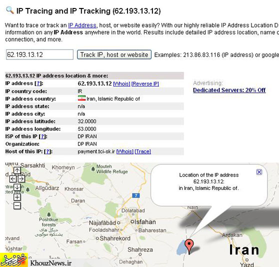 اگر كمي دقيقتر بررسي كنيم متوجه ميشود كه سايت مذكور در كشور ايران و آنهم توسط شركت مخابرات استان خراسان جنوبي Host شده است و اين امر نشاندهنده اين است كه Host مذكور نيز فاقد امنيت لازم بوده و كه احتمالاً چندين سايت دولتي ديگر را نيز خدماترساني مينمايد.