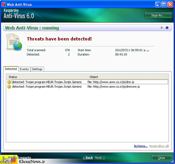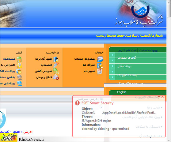 يكي از اين سايتها پرتال جامع شرکت آب و فاضلاب اهواز ( http://www.aww.co.ir ) است كه به محض ورود كاربر به اين سايت، دو تروجان (heur trojan script generic) را به كامپيوتر كاربر كپي نموده و موجب سرقت اطلاعات شخصي كاربران ميگردد.