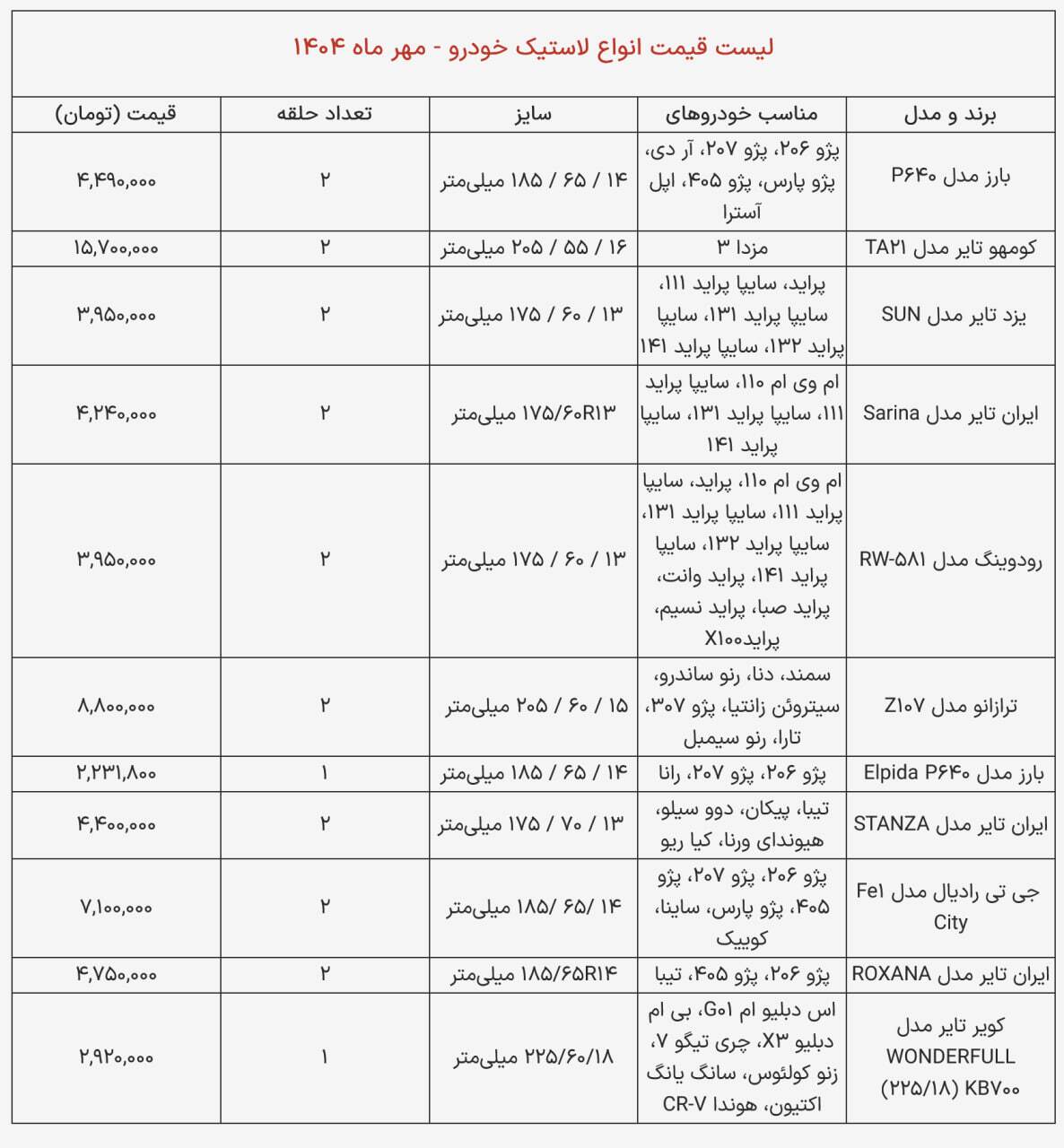 لیست قیمت انواع لاستیک خودرو/ یک جفت لاستیک پراید، سمند،کوییک، پژو ۲۰۶ و... چند شد؟ +جدول مهر ۱۴۰۴