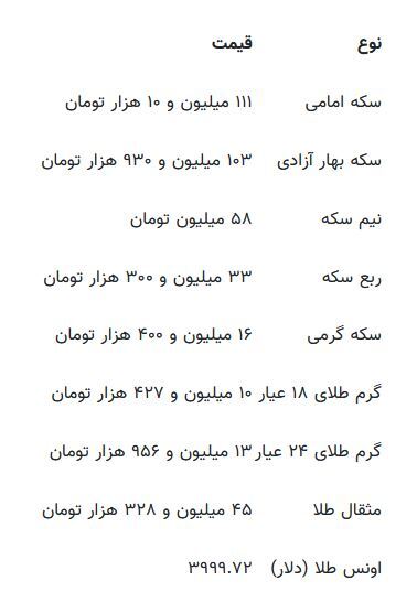 گزارش‌ها حاکی از آن است که هر قطعه سکه امامی با افزایش ۴۰۰ هزار تومانی، ۱۱۱ میلیون و ۱۰ هزار تومان شد.