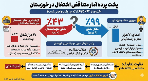اختلاف آمار اشتغال در خوزستان از ۴۳ درصد تا ۹۹ درصد، ابهام ایجاد کرده و این سؤال را پیش کشیده است که کدام روایت رسمی، وضعیت واقعی اشتغال استان را نشان میدهد؟
