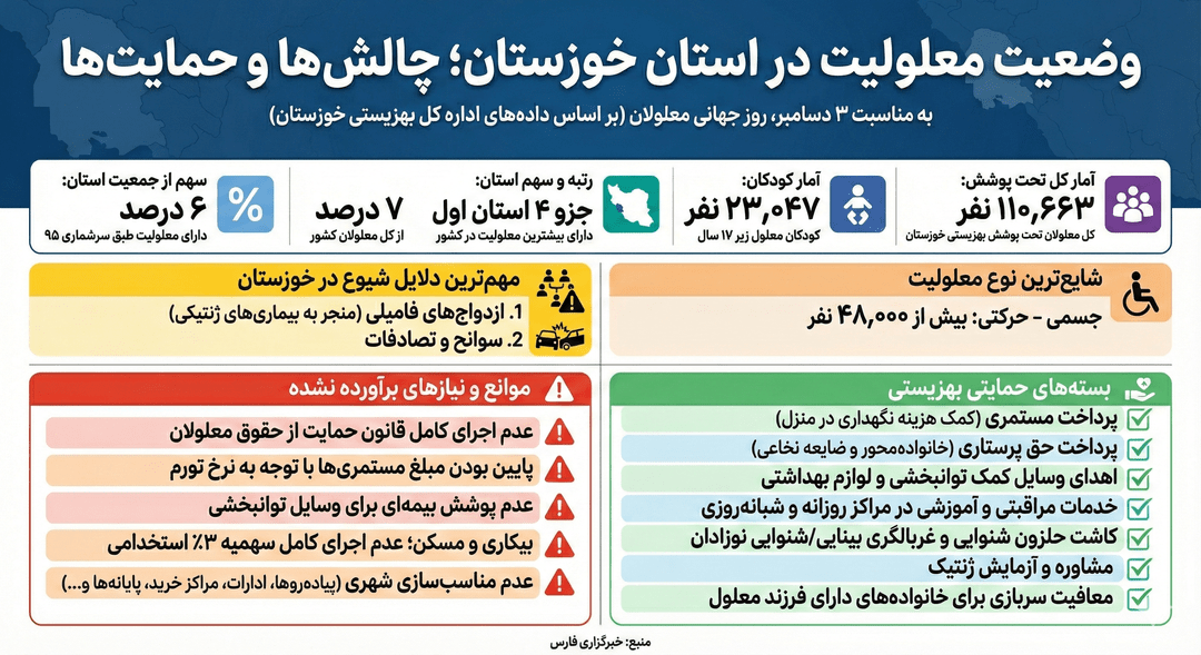 مدیرکل بهزیستی خوزستان با اعلام اینکه این استان با دارا بودن ۷ درصد از جمعیت معلولان کشور در رتبه چهارم قرار دارد، «ازدواجهای فامیلی» و «سوانح رانندگی» را از اصلیترین عوامل شیوع معلولیت در خوزستان برشمرد و از عدم مناسبسازی معابر شهری و اجرایی نشدن کامل قوانین حمایتی انتقاد کرد.