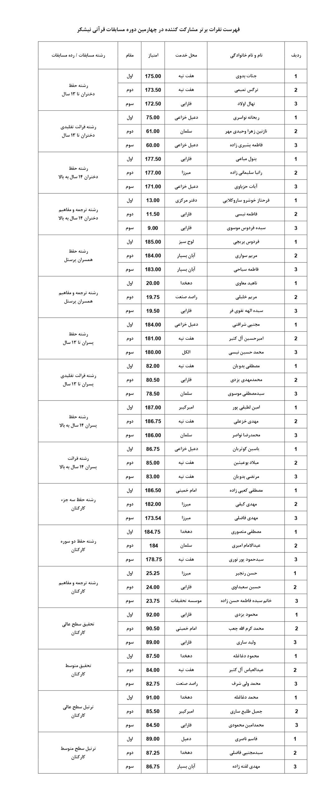 حجتالاسلام نعمتتبار دبیر چهارمین دوره مسابقات نیز با تشریح جزئیات رقابتها اظهار داشت: مسابقات در ۶ مقطع مجزا طراحی و اجرا شد که شامل دو رده سنی برای فرزندان پسر و دختر، بخش همسران محترم کارکنان و بخش کارکنان بود. باتوجهبه هر رده سنی، مشارکتکنندگان در ۵ رشته شامل حفظ، قرائت تقلیدی، قرائت ترتیل، قرائت تحقیق، و ترجمه و مفاهیم قرآن کریم ثبتنام و به رقابت پرداختند.