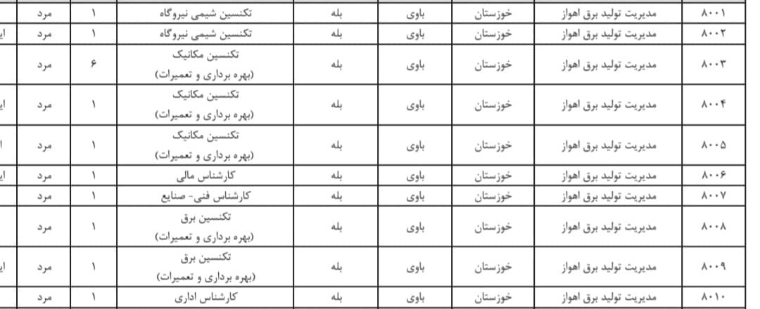 شرکت مادر تخصصی تولید نیروی برق حرارتی در نظر دارد نیازهای نیروی انسانی خود در شرکتهای مدیریت تولید برق (نیروگاهها) را به استناد مجوز صادره توسط وزارت نیرو و بر اساس موافقت مجمع عمومی شرکتهای مذکور، به تعداد 200 نفر برای اشتغال در مشاغل تکنسینی/کمک کارشناسی و کارشناسی از میان فارغالتحصیلان دانشگاهها و موسسات آموزش عالی مورد تایید وزارت علوم، تحقیقات و فناوری، تامین کند.